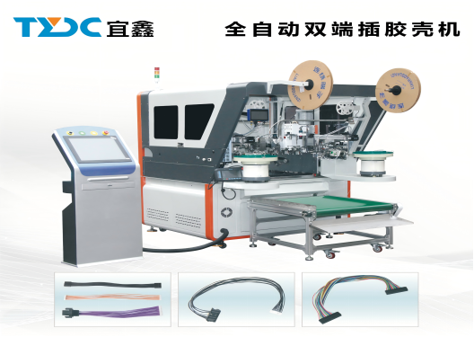 该设备可实现双端插胶壳,线材一端自动切线,剥皮,打端,插壳;另一端自动切线,剥皮,打端,插壳等功能的全自动双端插胶壳机。(搭配四镜头CCD检测,可检测铜丝数量)